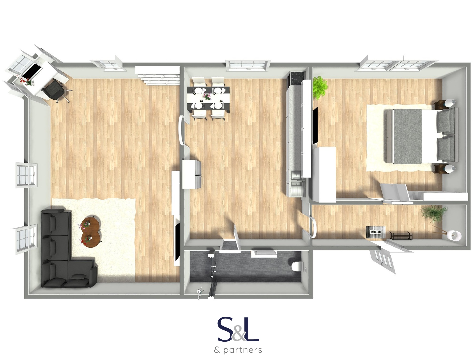 Dispozice tohoto útulného bytu 2+1 o výměře 64 m² je velmi praktická a nabízí všechny potřebné komforty. Prostorný obývací pokoj je ideální pro relaxaci nebo společné chvíle s rodinou a přáteli. Přes obývák se vstupuje do kuchyně, která je dostatečně velká na to, aby se v ní dobře vařilo a stolovalo. Samostatná ložnice poskytuje dostatek soukromí a klidu, zatímco zděná koupelna s podlahovým vytápěním má sprchový kout a toaletu, což zvyšuje komfort během chladnějších dní. Vstupní chodba je prakticky zařízená, nabízí dostatek prostoru na odkládání oblečení a obuvi.