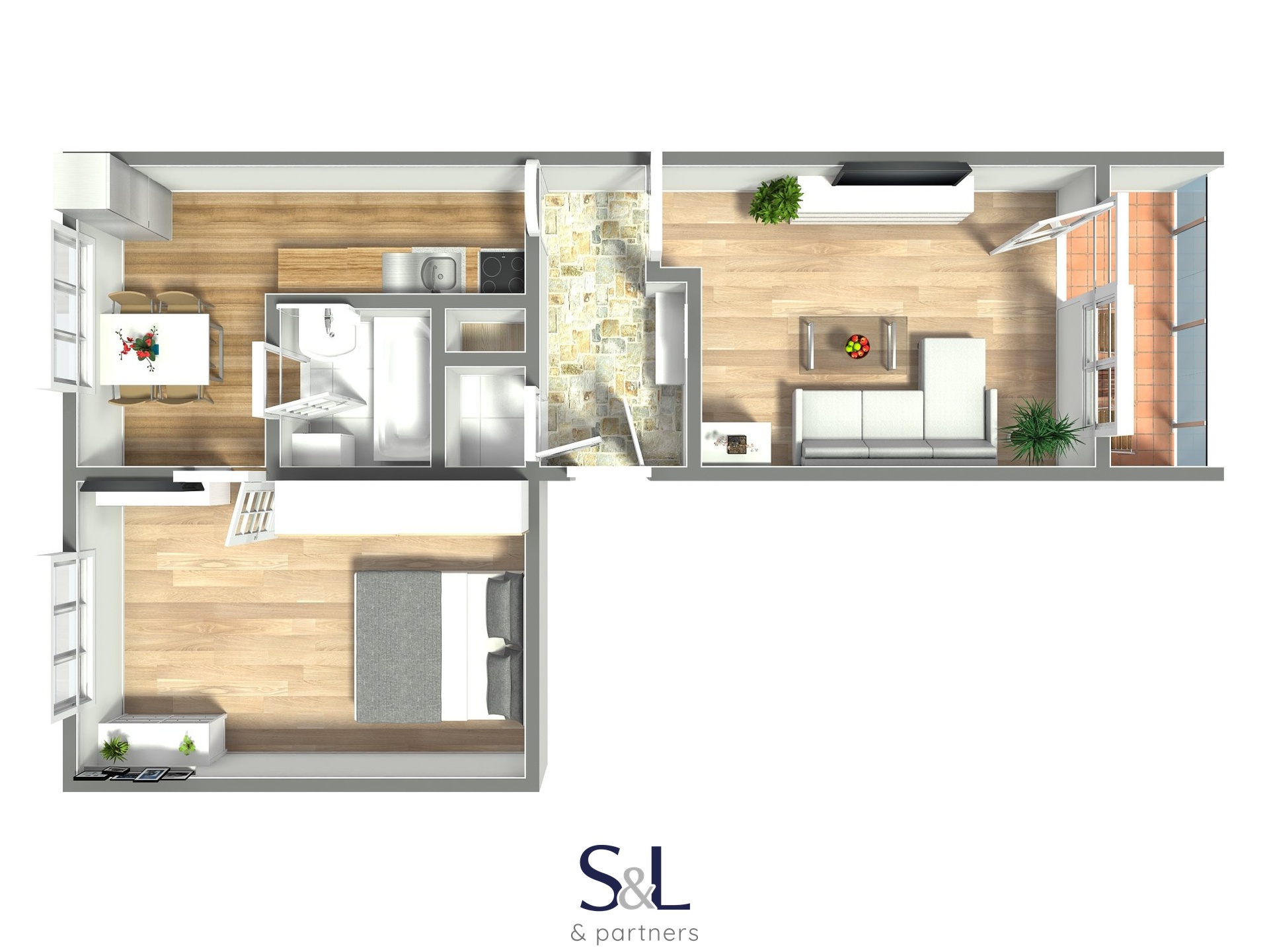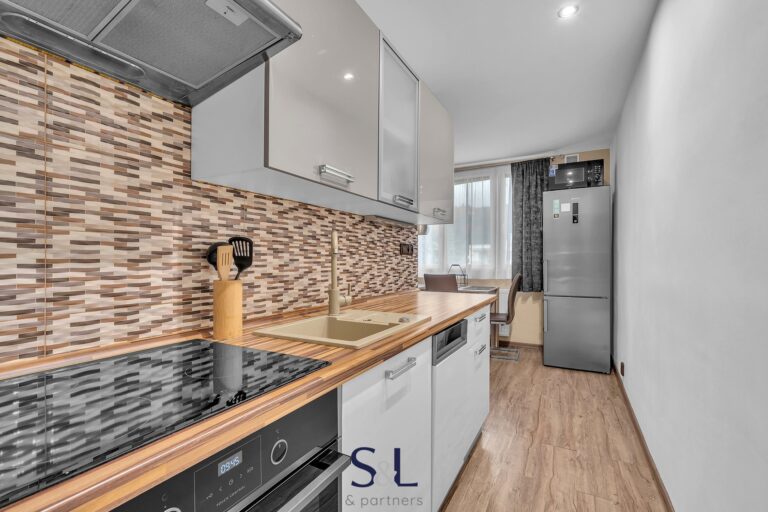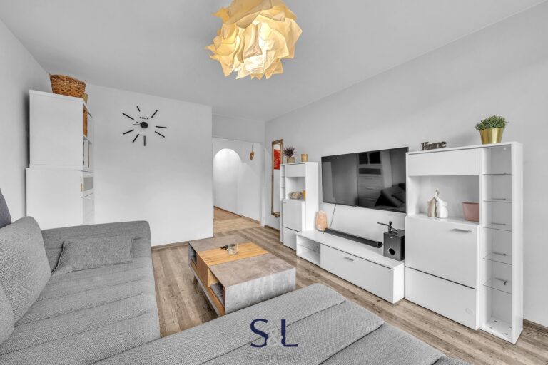 Byt o celkové ploše 55 m² je ideální volbou pro jednotlivce, pár nebo mladou rodinu. Vše je připraveno k okamžitému nastěhování – kuchyň je plně vybavená včetně spotřebičů, v koupelně najdete vanu i pračku, WC je samostatné. Byt má dva neprůchozí pokoje, přičemž z jednoho z nich je přímý vstup na lodžii s posezením. K bytu náleží také sklep o velikosti 3 m².
