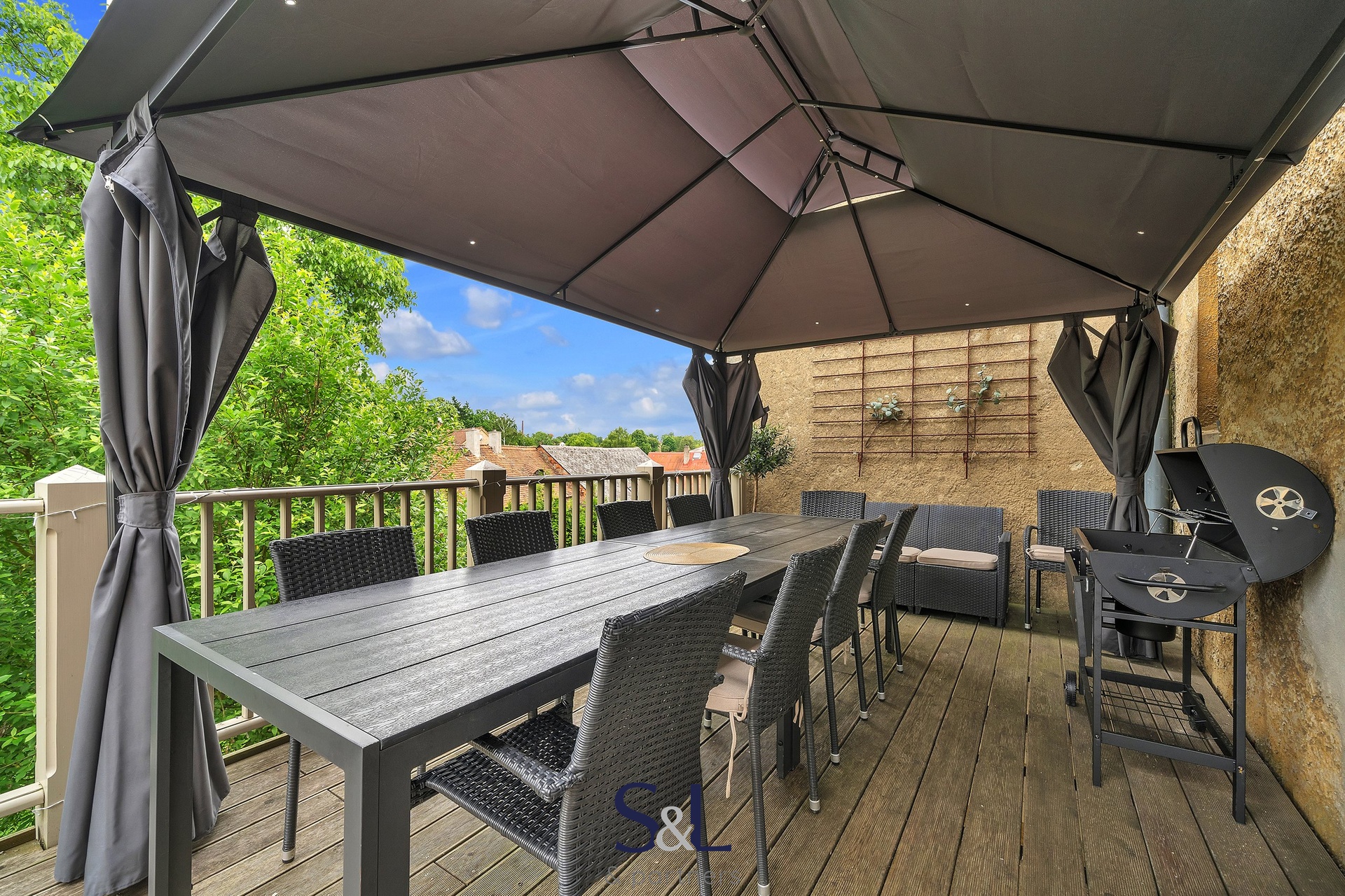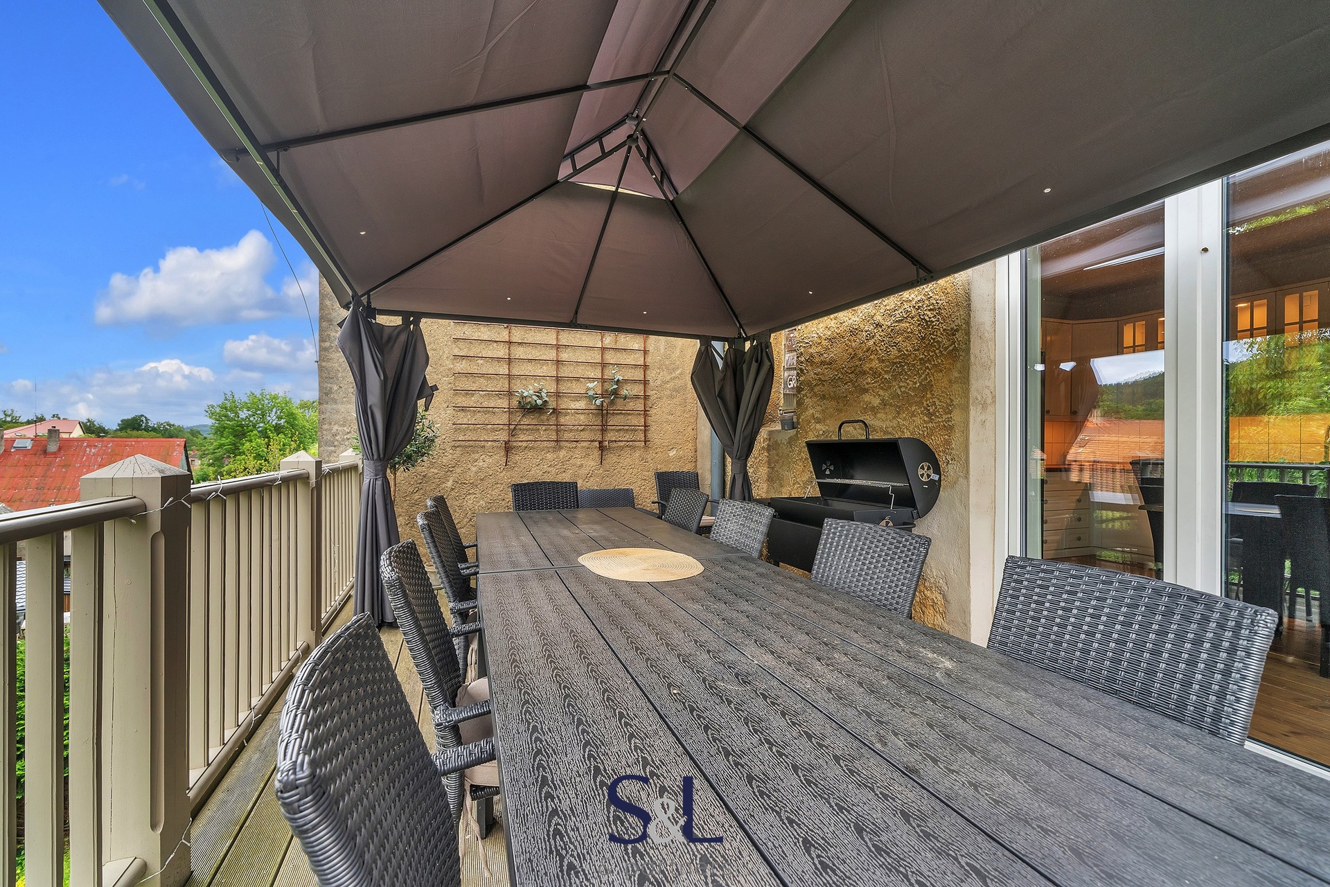 Pocit jako v domě, ale bez starostí – vstup na terasu, krb, velká kuchyně, dostatek místa.