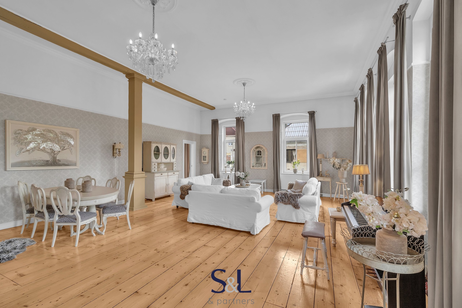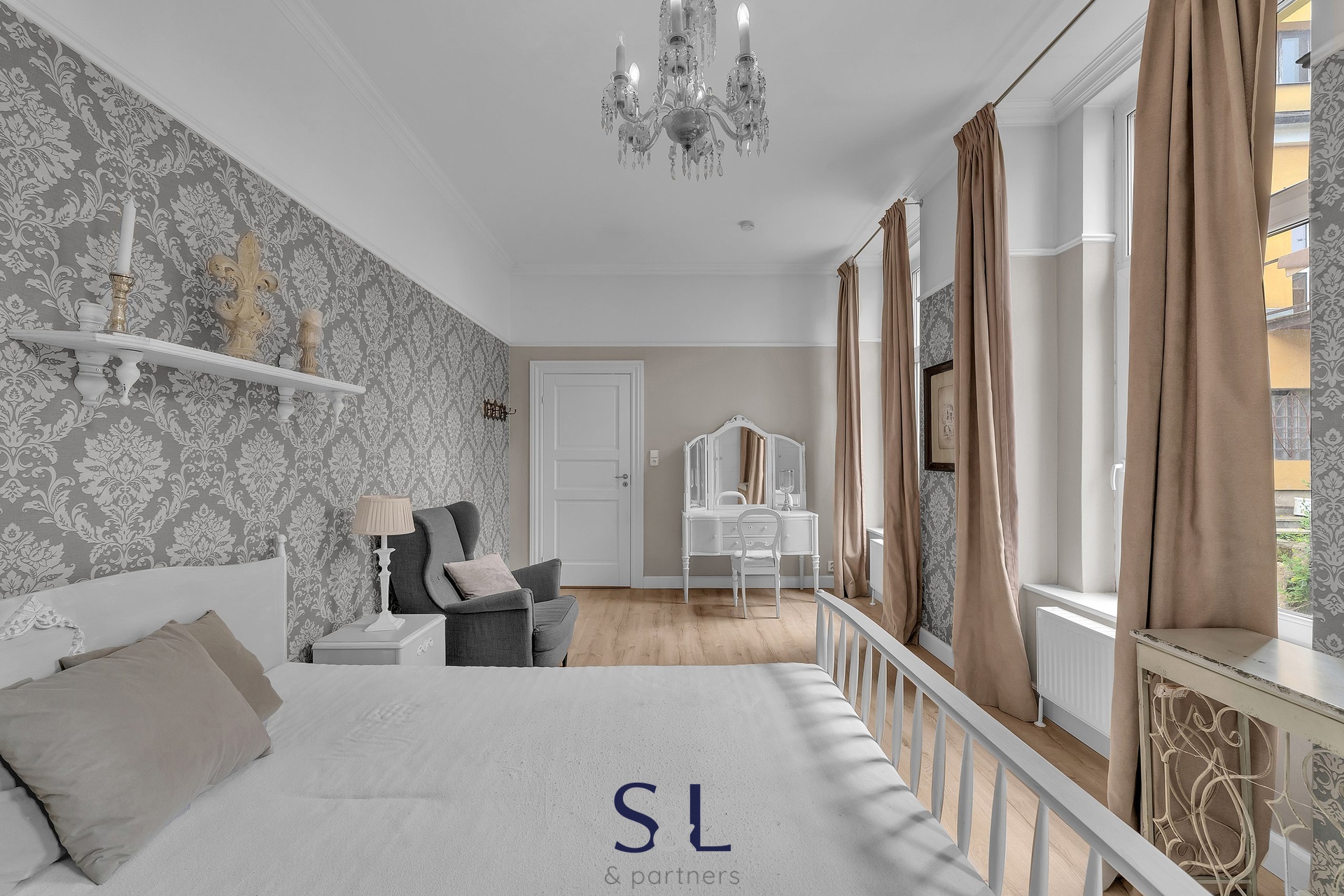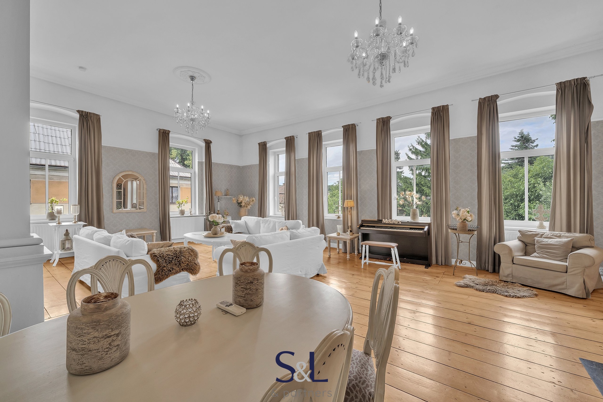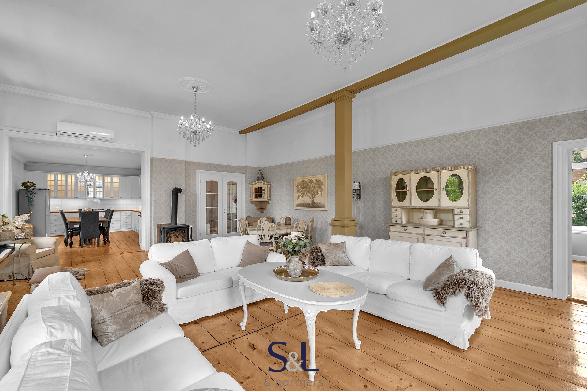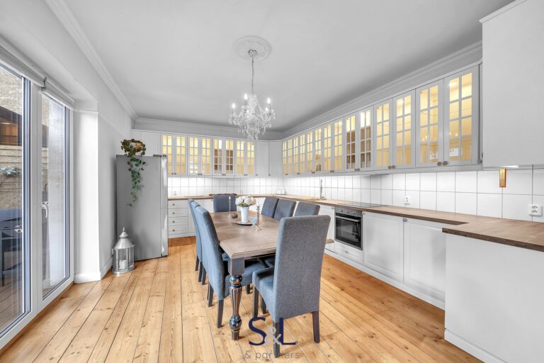 Byt je zcela nový – vše od podlah přes rozvody až po klimatizaci s tepelným čerpadlem (možnost v zimě levně topit) v obývacím pokoji. Původní smrkové podlahy, vysoké stropy, stylové lustry, jemně vzorované tapety a citlivý výběr barev vytváří harmonický prostor s nádechem francouzského venkova.