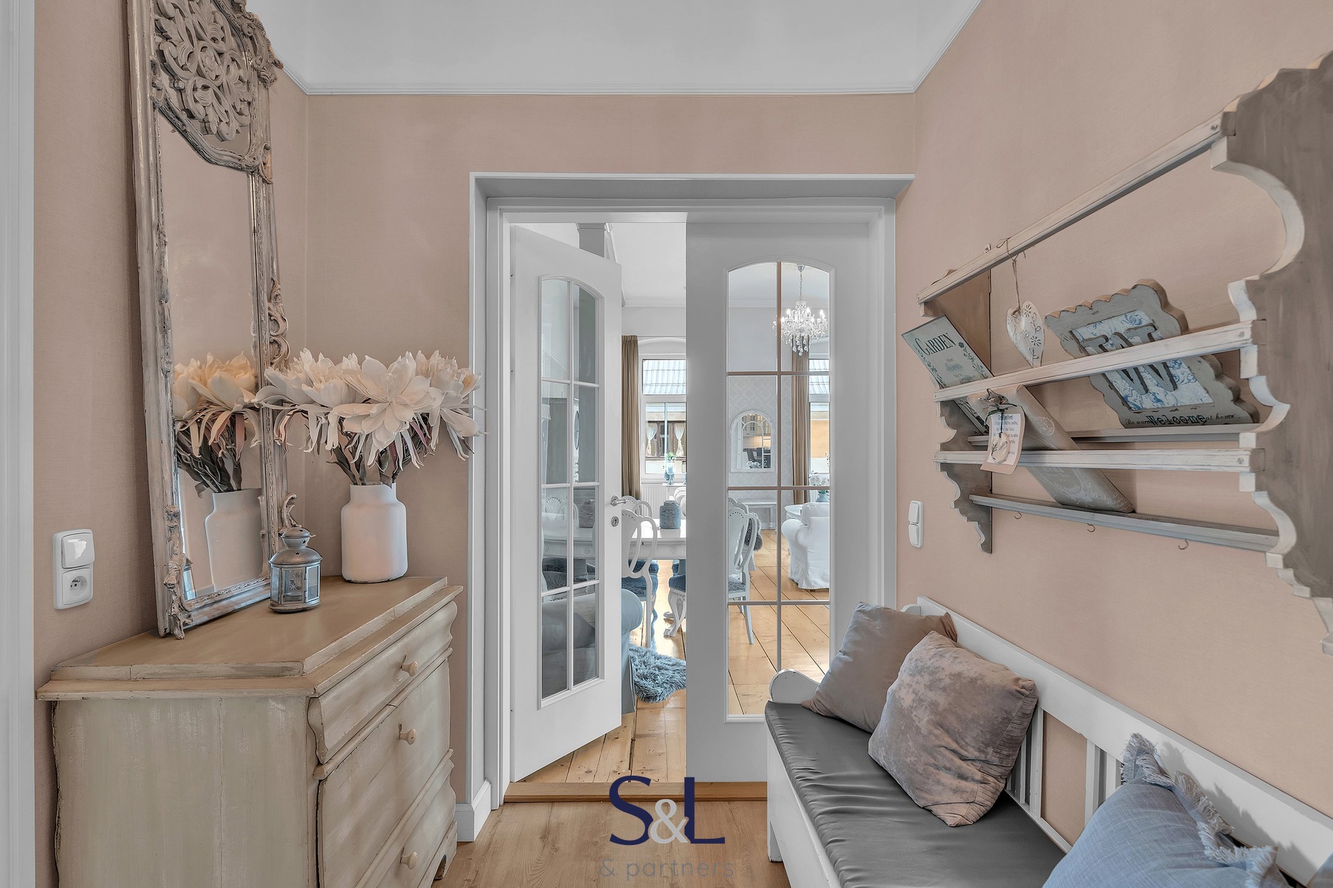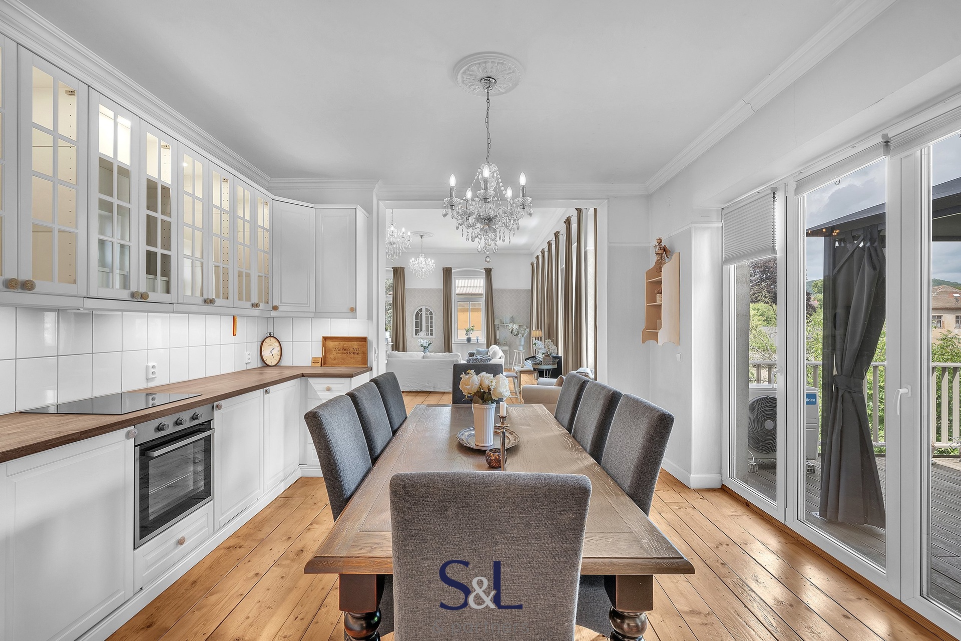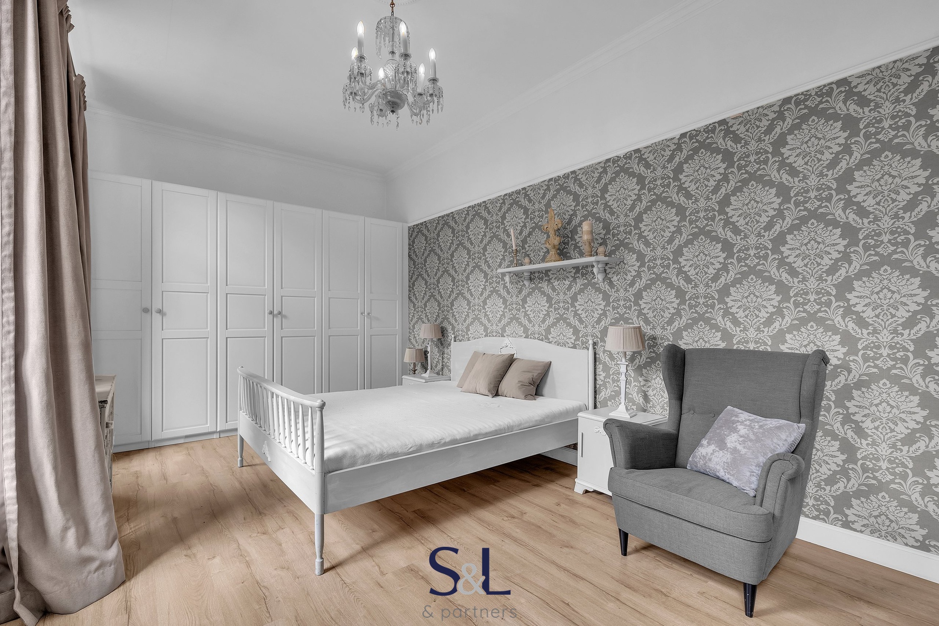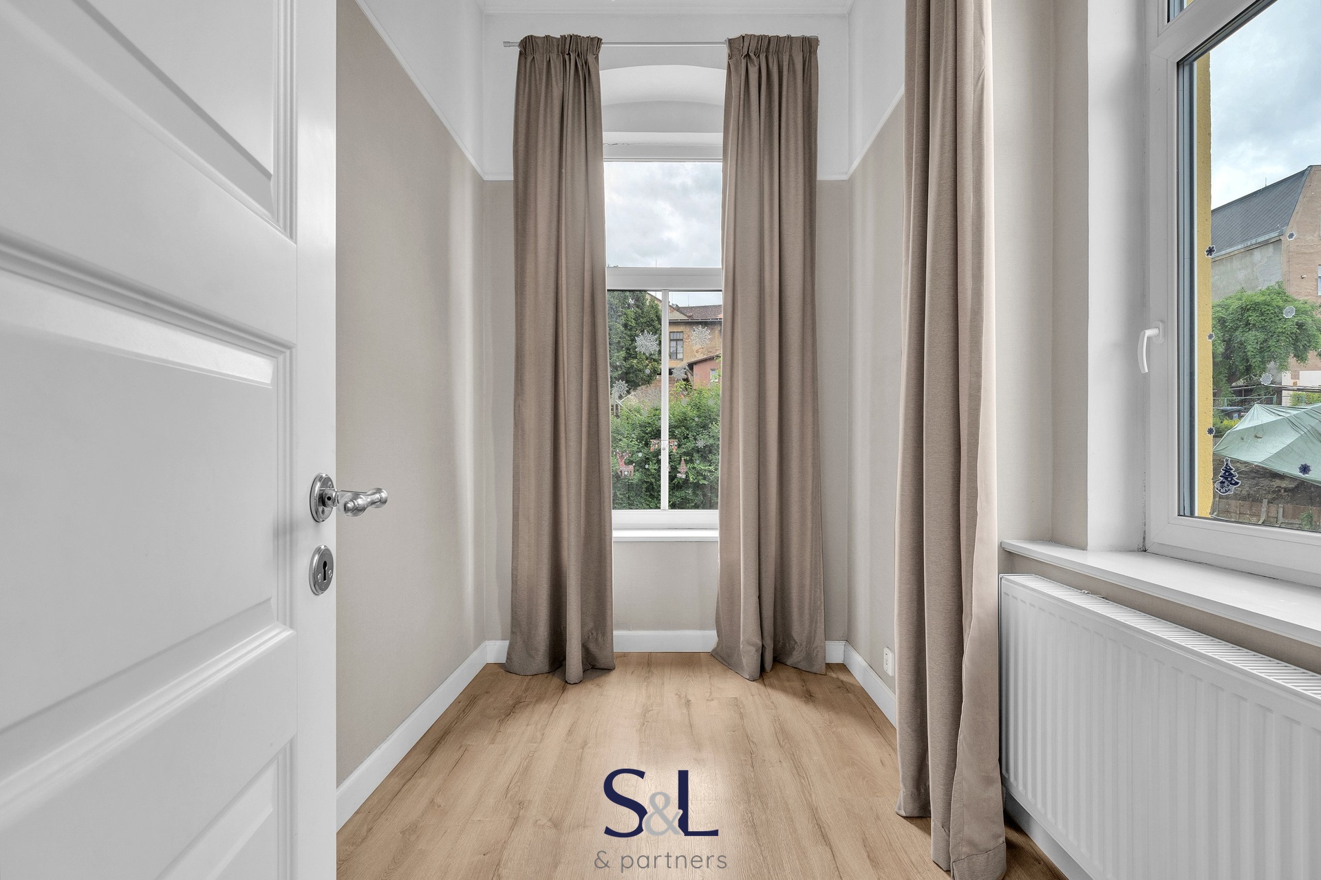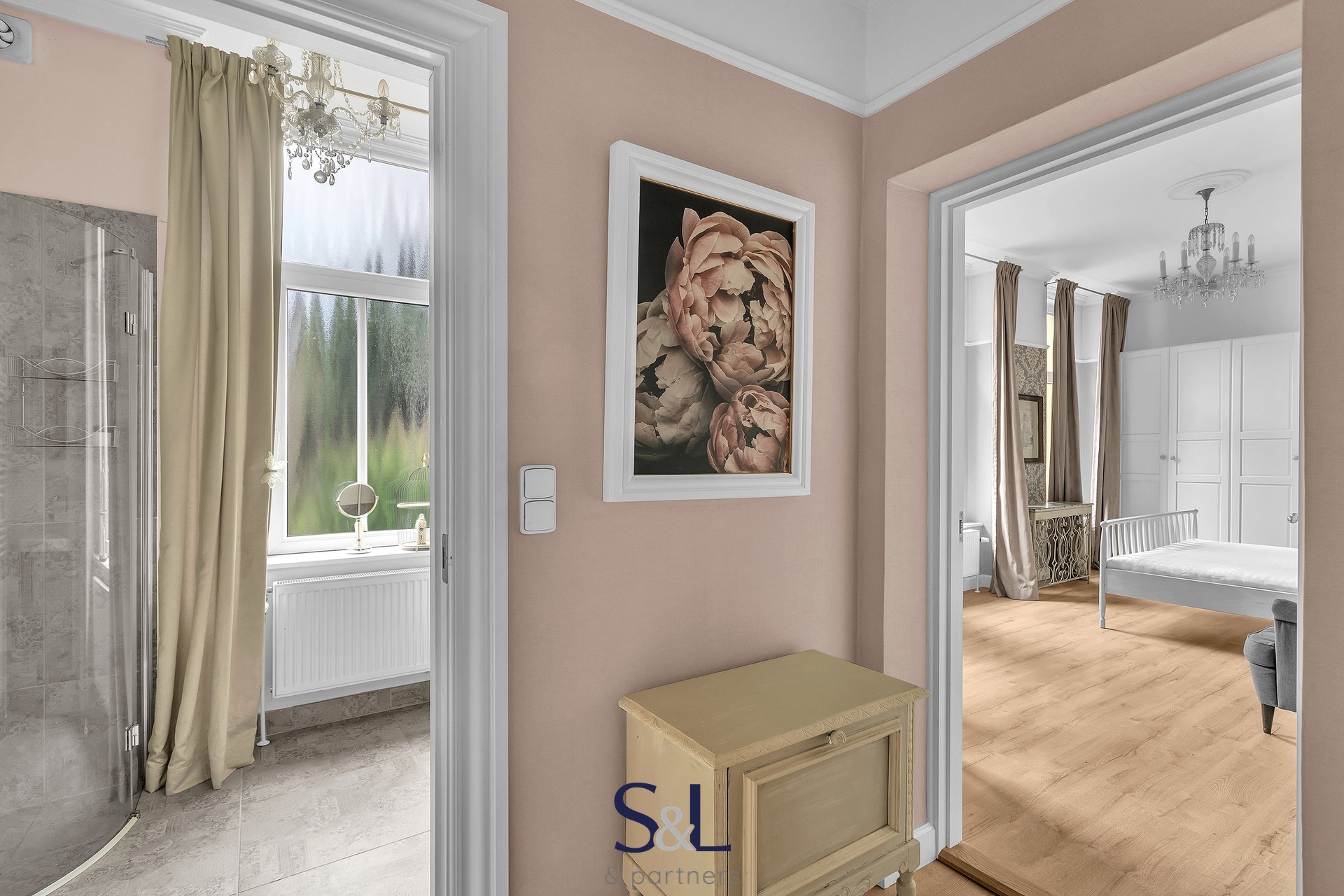 Byt je zcela nový – vše od podlah přes rozvody až po klimatizaci s tepelným čerpadlem (možnost v zimě levně topit) v obývacím pokoji. Původní smrkové podlahy, vysoké stropy, stylové lustry, jemně vzorované tapety a citlivý výběr barev vytváří harmonický prostor s nádechem francouzského venkova.
