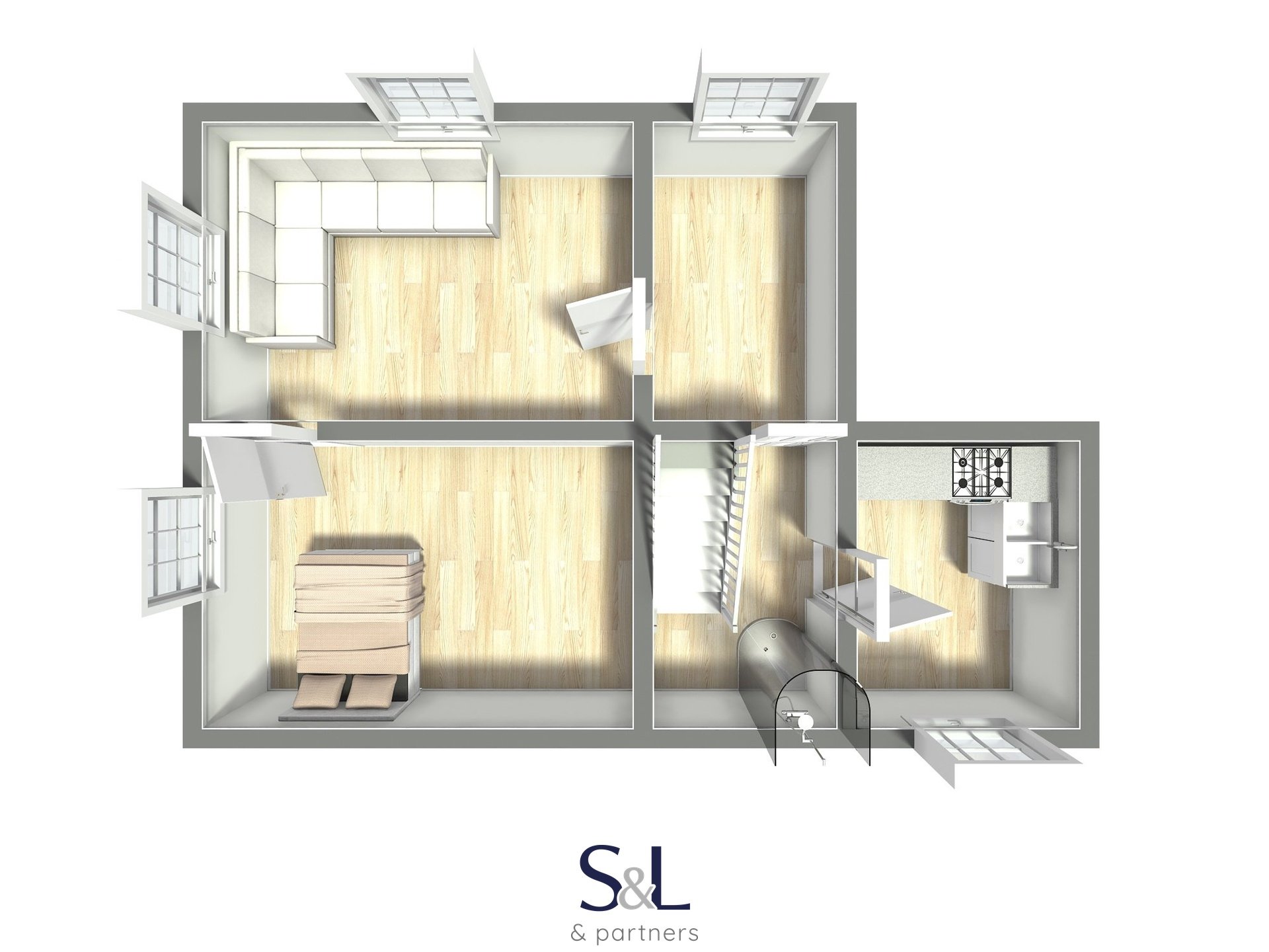 Dispozice nabízí vstupní chodbu, ve které jsou schody do patra, kde nalezneme kuchyň, a tři pokoje, které můžete využít přesně podle Vašich představ.