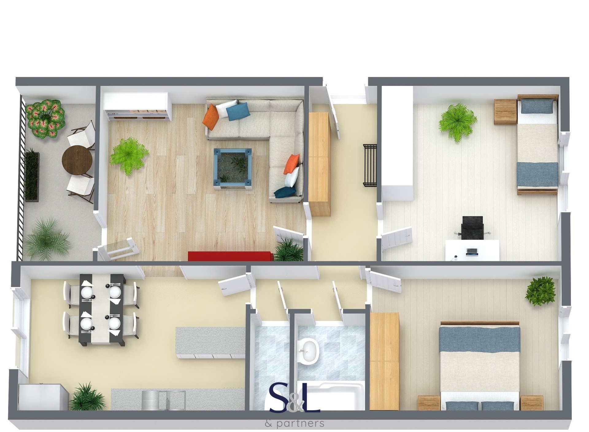 Součástí bytu je také sklepní kóje a velká sušárna přímo na patře, ideální pro pohodlné sušení prádla či uskladnění věcí.