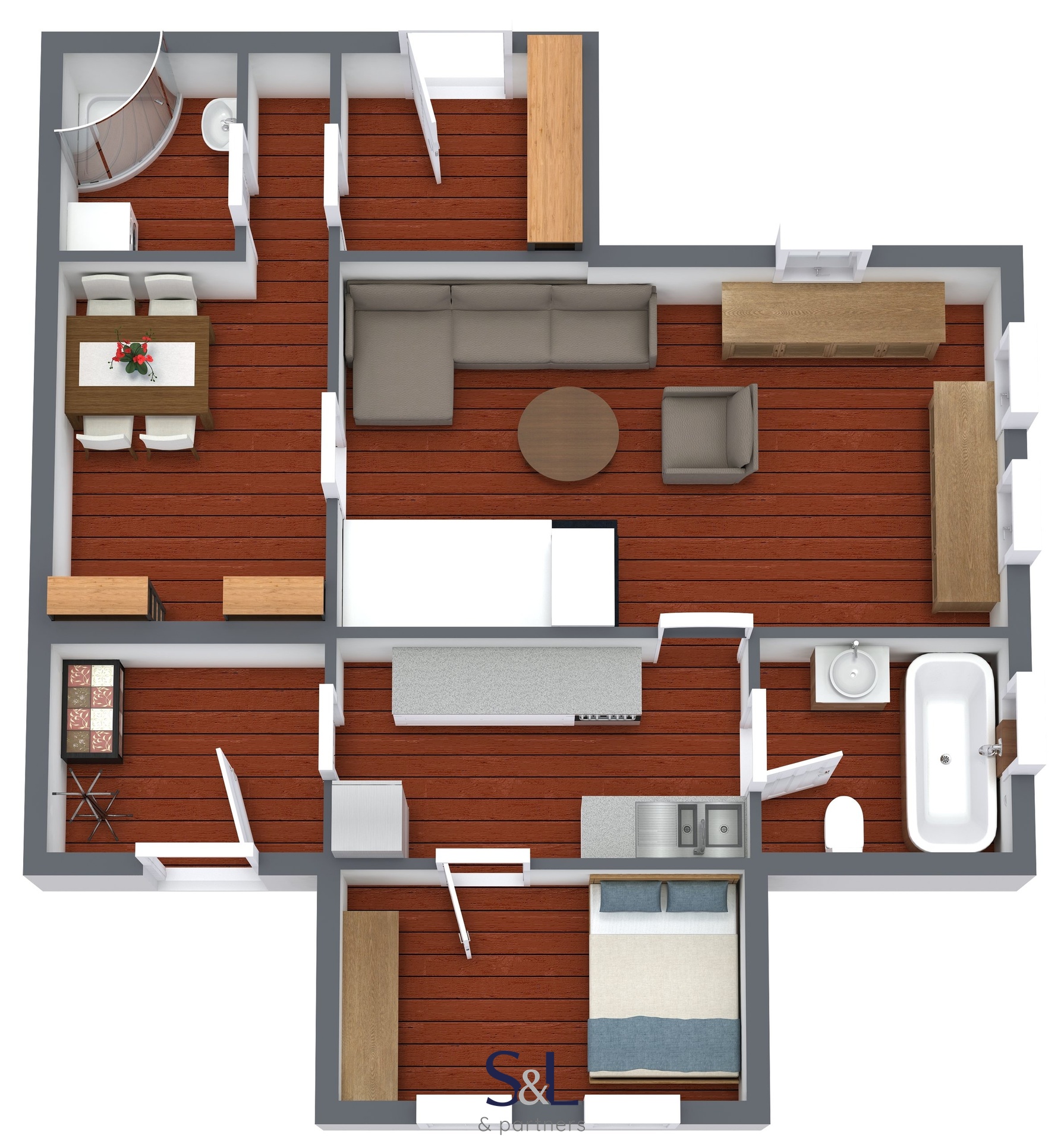 – Na opačné straně, oddělené přes obývací prostor, je jídelní kout a další koupelna se sprchovým koutem.