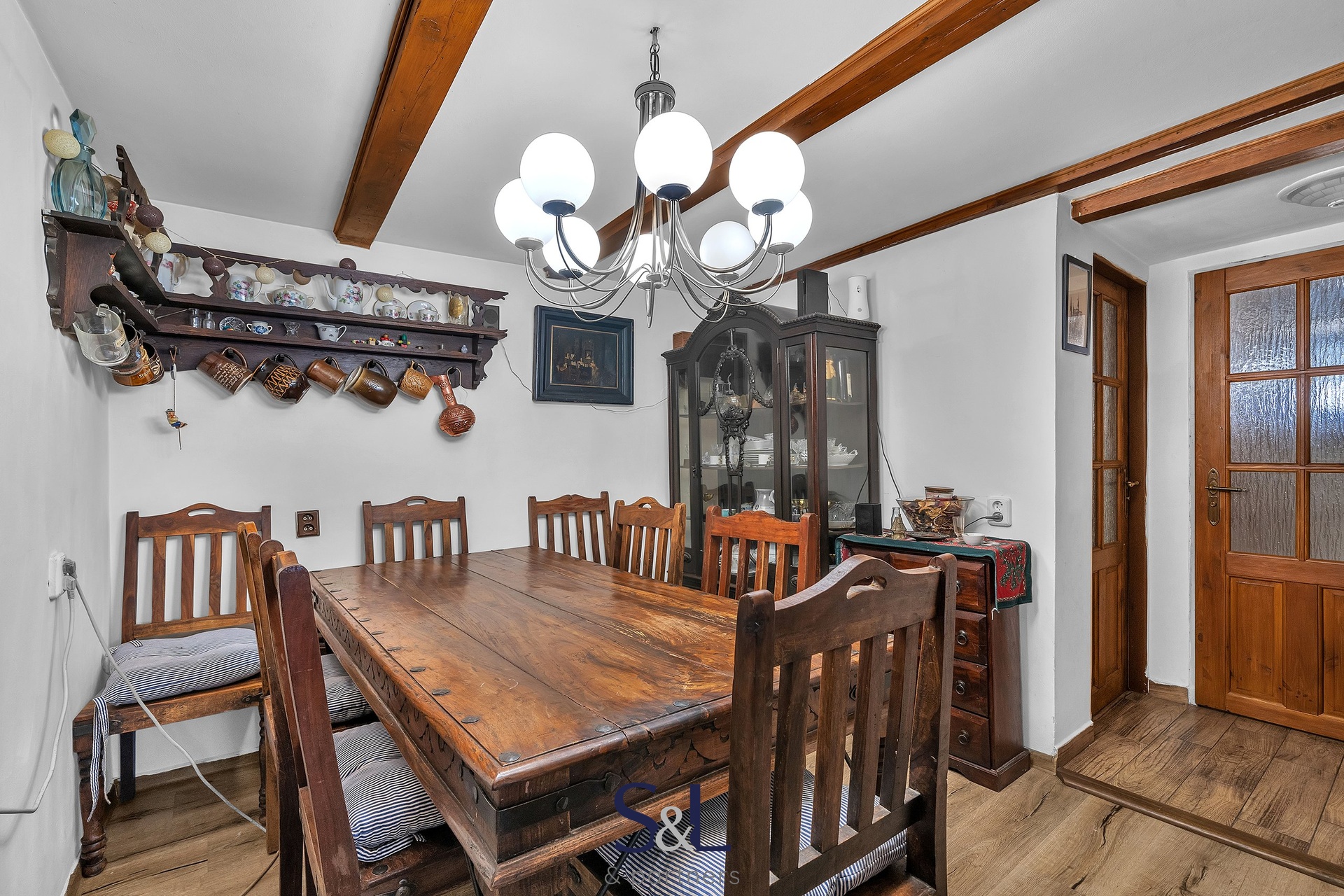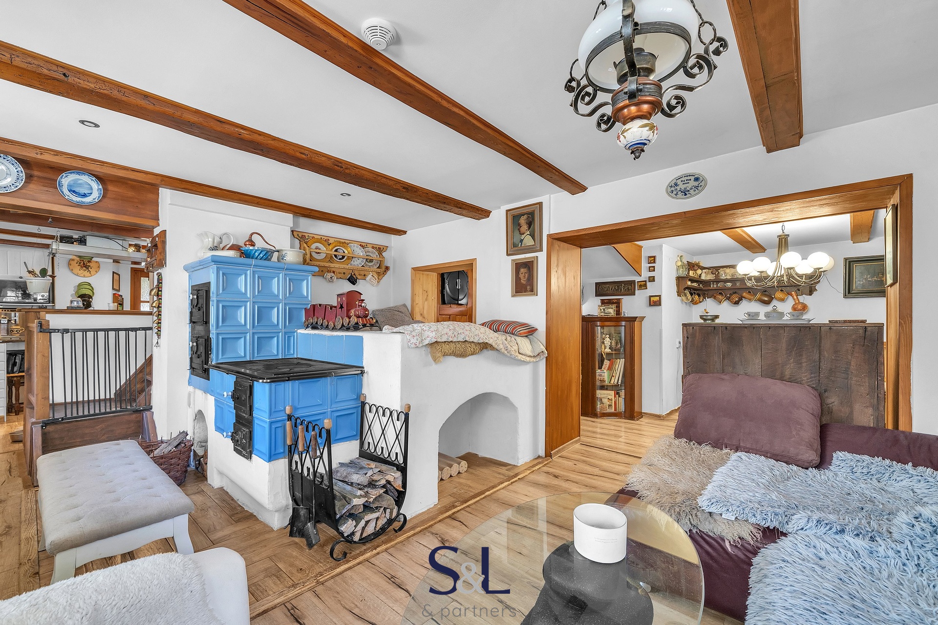 – V přízemí se nachází velká společenská místnost s dominantní pecí, která je srdcem domu a ideálním místem pro večerní posezení.