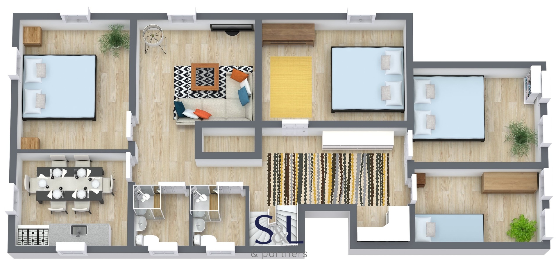 – celkem 11 pokojů, 3 kuchyně, 4 koupelny, velká společenská místnost a technické zázemí,