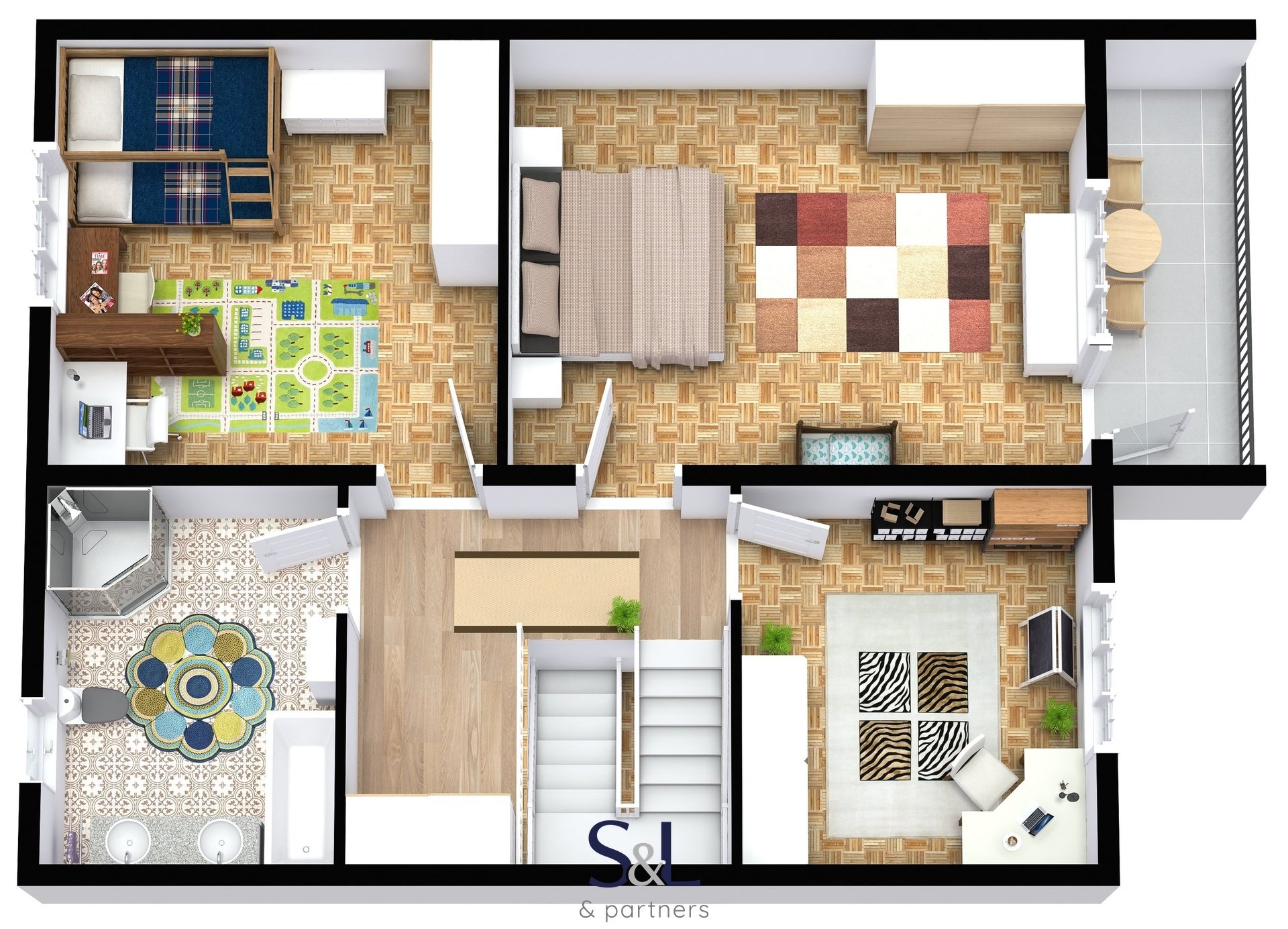 V přízemí se nachází vstupní chodba, 2 prostorné komory, kuchyně, centrální hala se schodištěm a obývací pokoj s krbem. V patře jsou tři samostatné místnosti a koupelna. Podkroví je možné upravit na další obytný prostor o cca. 25 m².