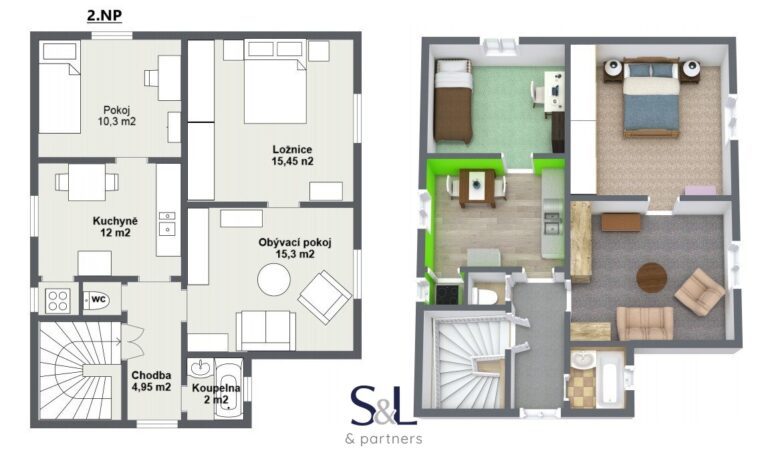 • 2. nadzemní podlaží: byt 3+1 o užitné ploše 60 m² (kuchyně, ložnice, dva pokoje, koupelna).