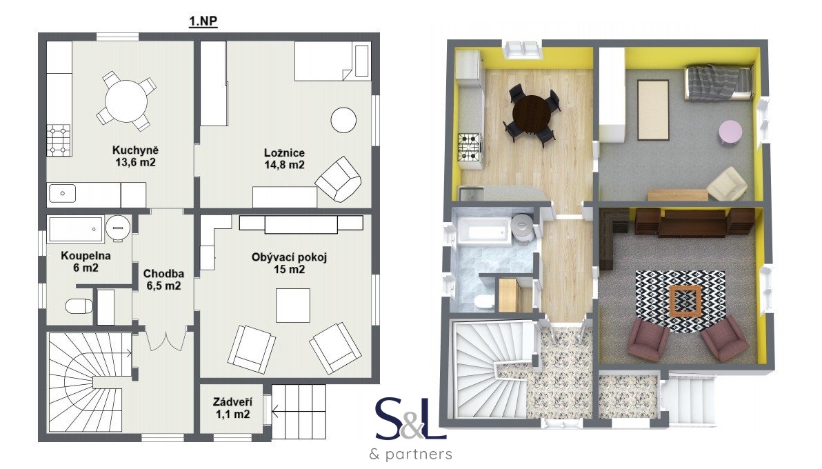 • Přízemí: bytová jednotka 2+1 o užitné ploše 57 m² (kuchyně, obývací pokoj, ložnice, koupelna).