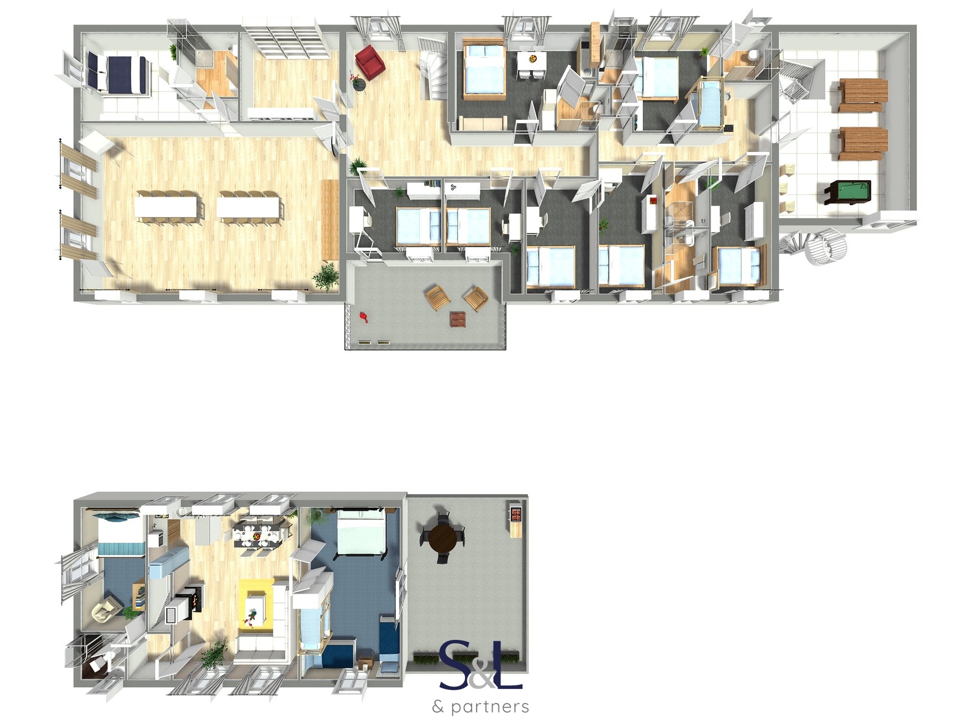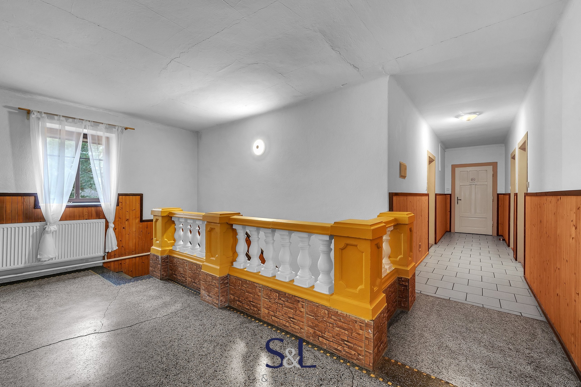 V patře domu jsou situovány jednotlivé pokoje s více jak 30ti lůžky, konferenční místnost a výstup na terasu s posezením.
