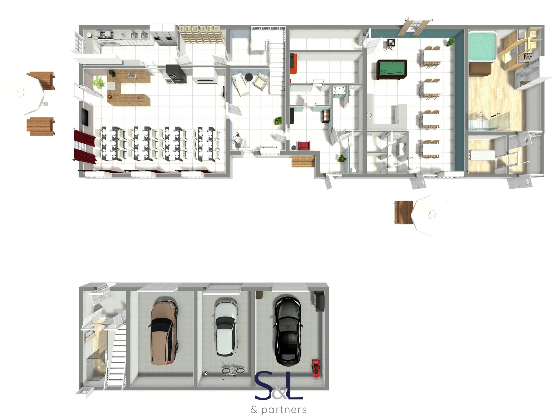 Kromě hlavního domu je součástí prodeje i druhý domek, ve kterém je v přízemí situována velká koupelna, tři garáže a v patře domu je prostorný apartmán o dispozici 3+KK s velkou terasou.
