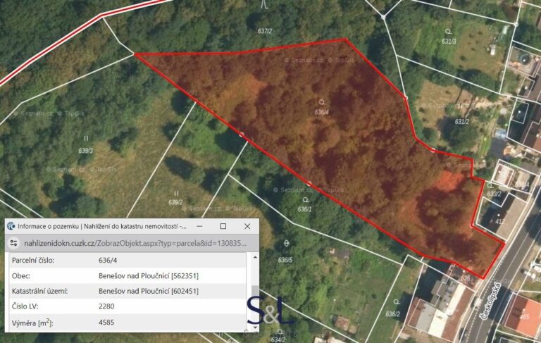 Pozemek je o celkové výměře 4.585 m2 a je vedený v katastru nemovitostí jako zahrada. Spodní část pozemku se dle územního plánu nachází v plochách typu bydlení předměstského, kde lze realizovat stavbu rodinného domu. Horní část pozemku se nachází v plochách zemědělské půdy.