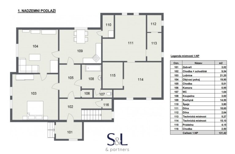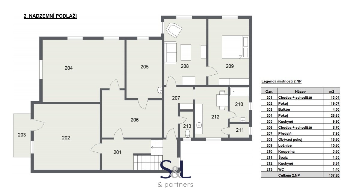 Podlahová plocha 302,70 m2 je rozdělaná mezi jednotlivá podlaží takto: