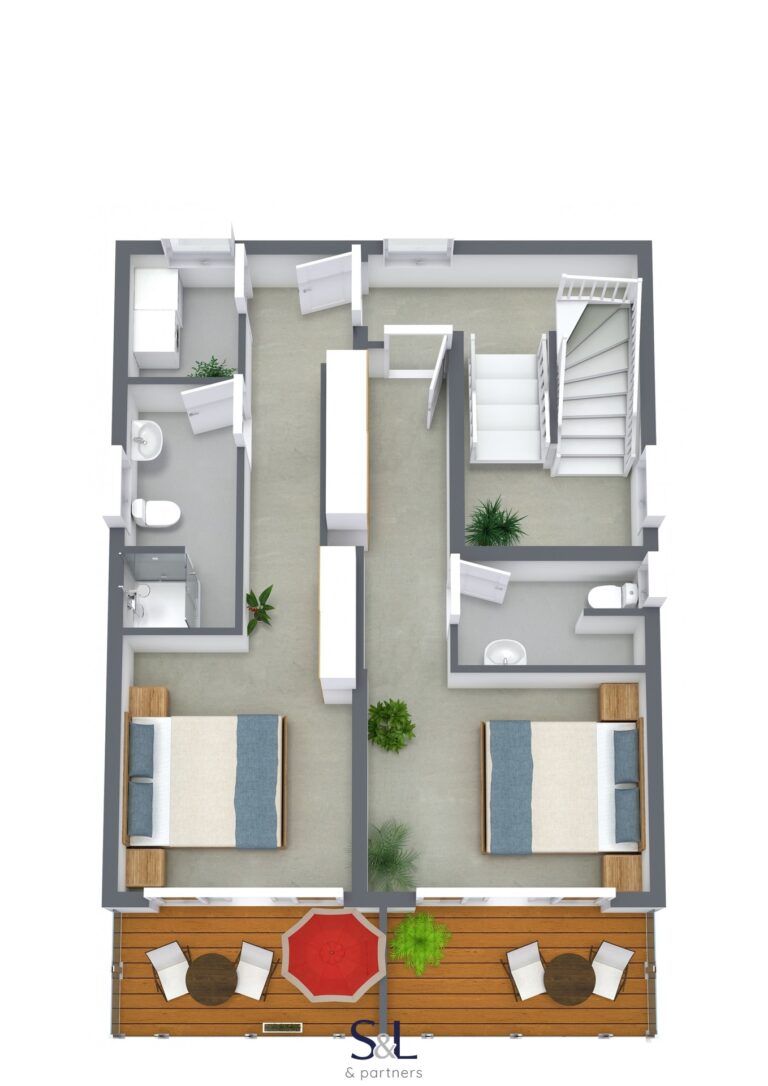 – První patro: Nachází se zde další ložnice s koupelnou a exkluzivní rozlehlá terasa, která nabízí soukromí a neuvěřitelné panoramatické výhledy na okolí.